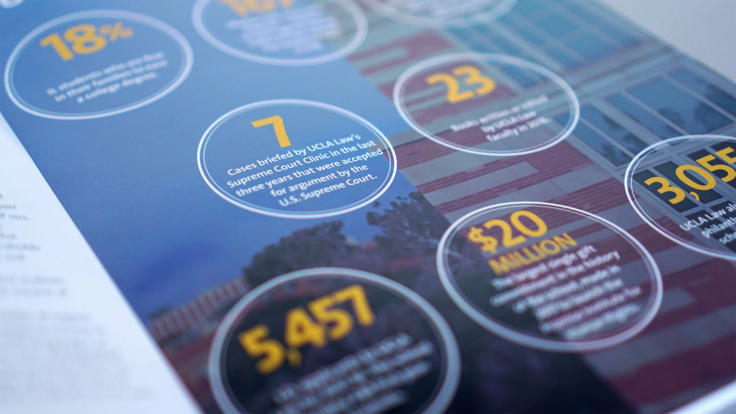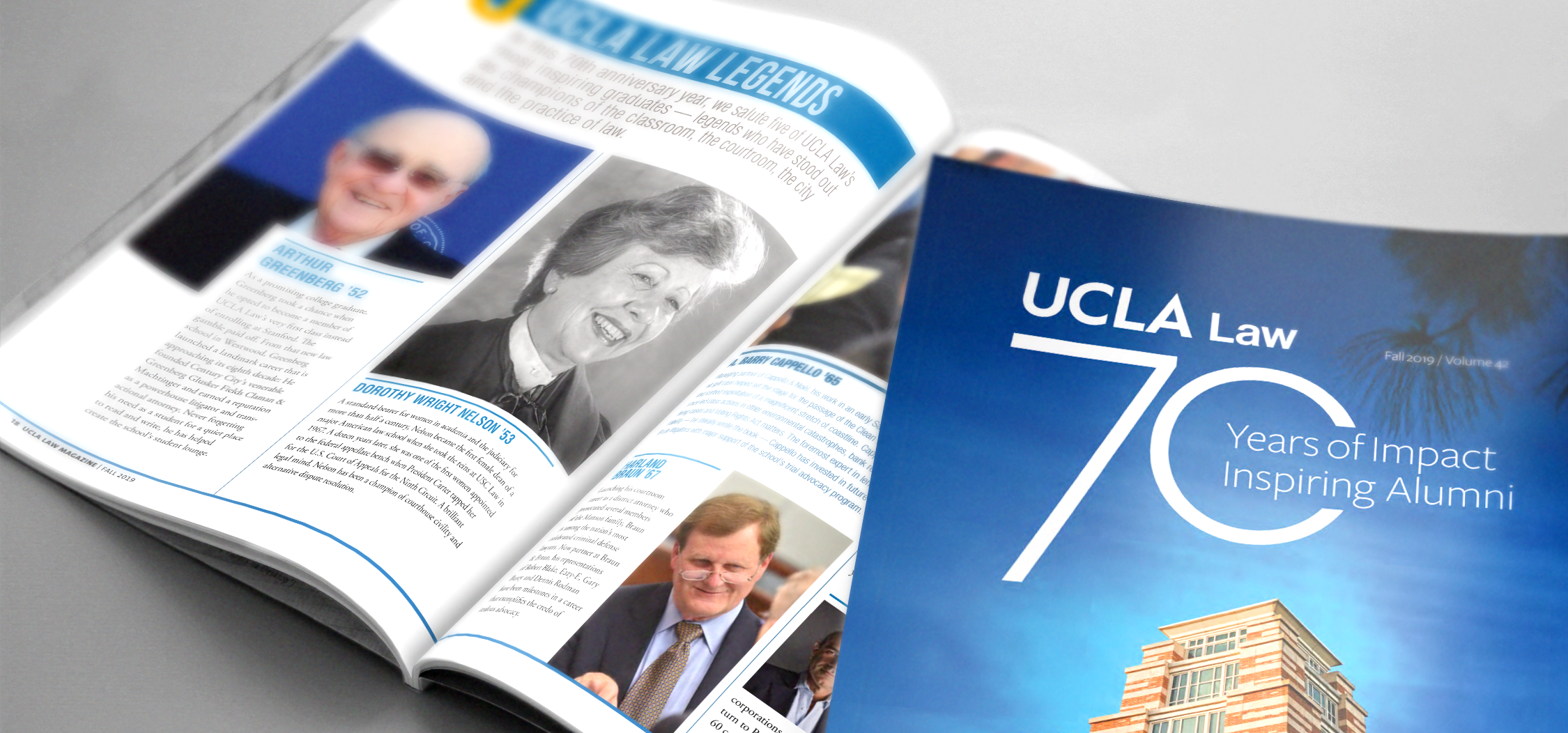 For many years, I worked with UCLA School of Law on the design and production and publication of UCLA Law , the school’s flagship publication for alumni, donors, and peers in the legal community. As both a storytelling platform and a key marketing tool, the annual magazine highlighted the school’s thought leadership, faculty research, and alumni impact while reinforcing UCLA Law’s national reputation. Our collaboration included a complete redesign of the publication to modernize its look and strengthen its role in alumni engagement, donor relations, and reputation building, particularly in support of rankings such as U.S. News & World Report.