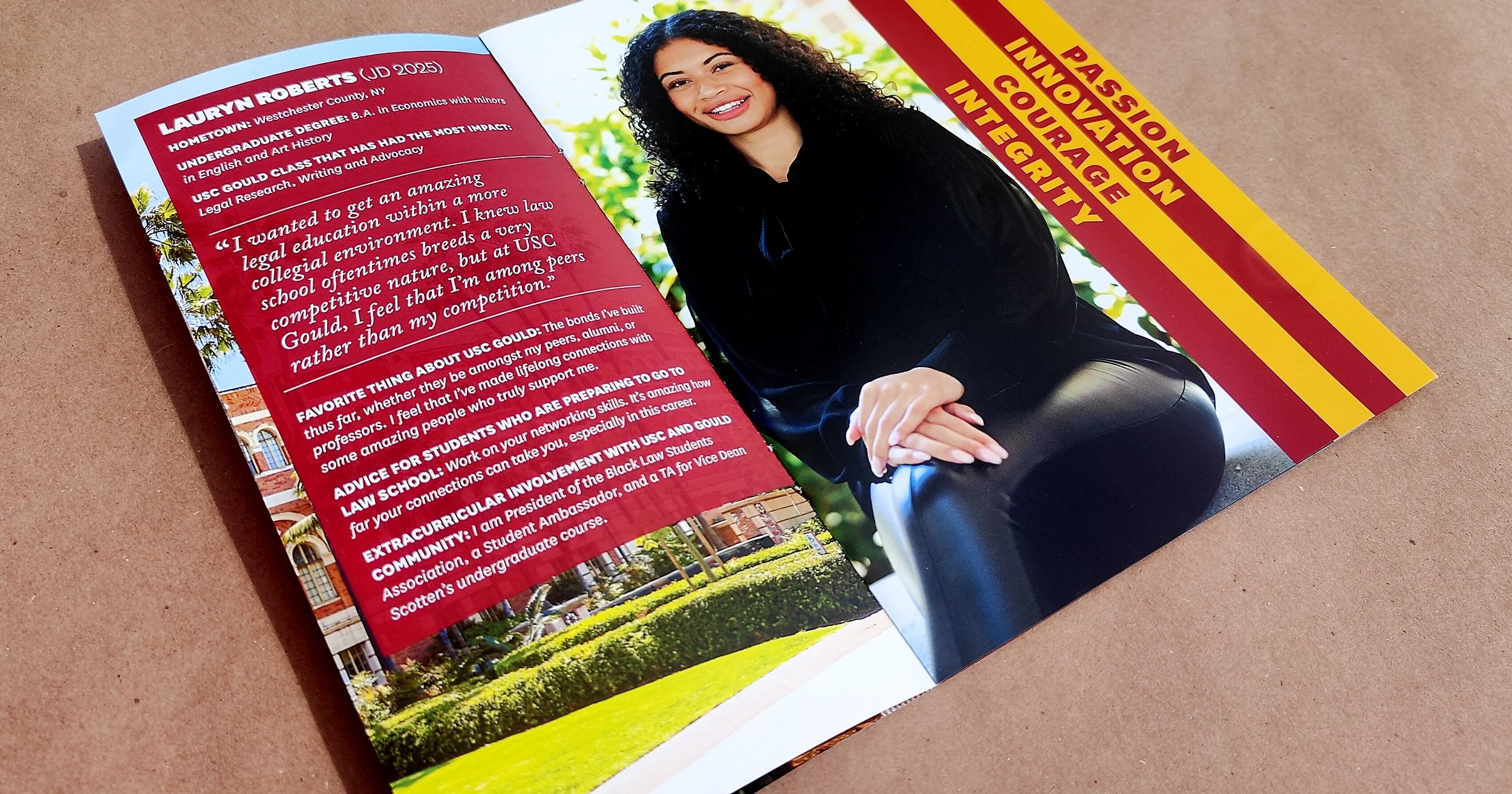 ETCH partnered with the USC Gould School of Law to create a conversion brochure designed to help admitted students take the next step and commit to enrollment. The piece highlighted the vibrant, supportive Gould community through authentic storytelling and photography that captured life beyond academics while reinforcing the school’s values of passion, innovation, courage, and integrity.